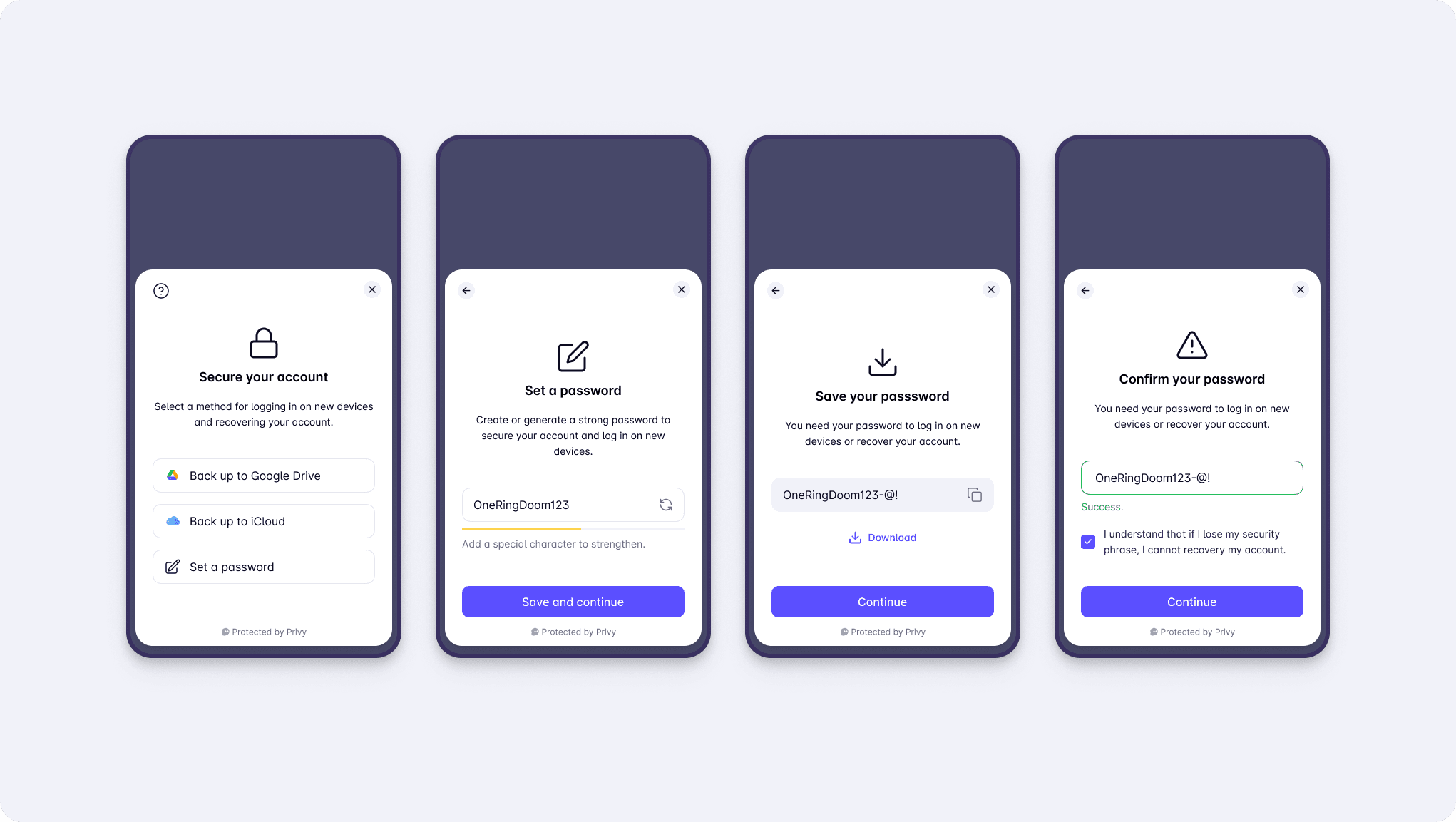 This means the user controls exactly how the recovery share is encrypted with no dependency on Privy infrastructure, but it also means they’ll have to reinput that password to provision a new device. If they lose their device and forget their password, they’ll lose access to their account. No password resets here.