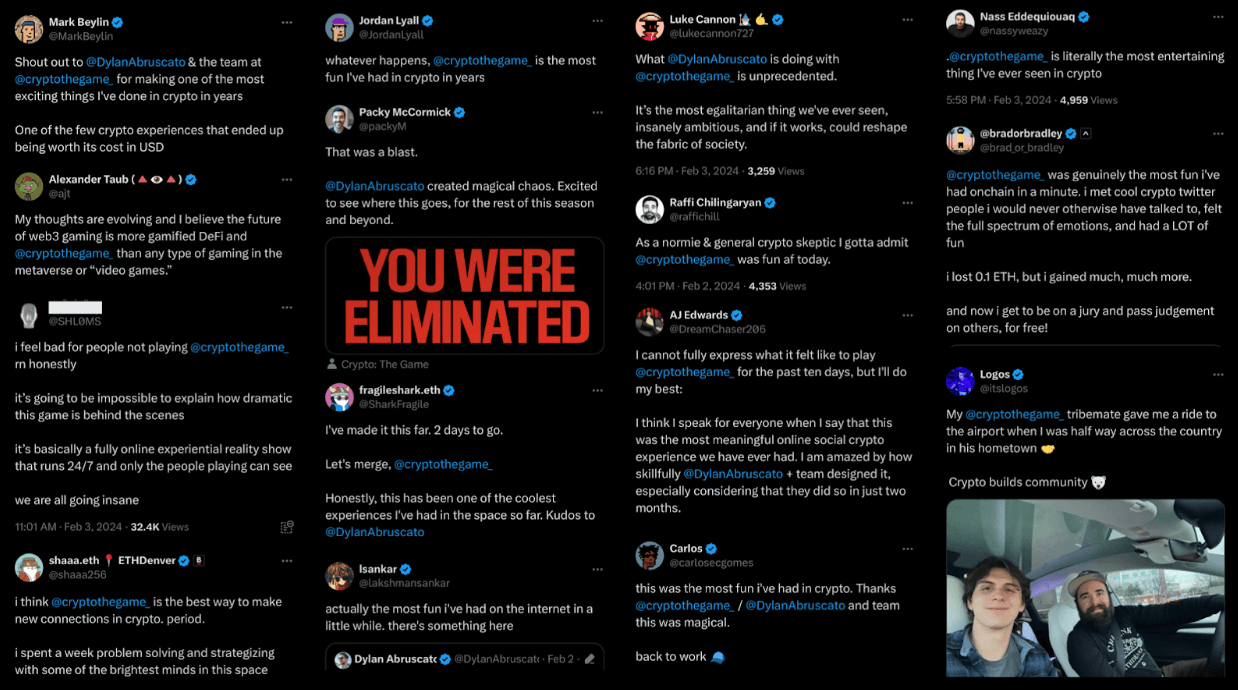 We are starting to see a new class of onchain activity emerge which uniquely leverages the shared state and simple payments of onchain systems. While Season 1 made use of crypto mostly as part of simple payments to the prize pool, we are excited by all of the subtle ways in which the game leverages onchain dynamics and a native internet culture to create a whole new experience.