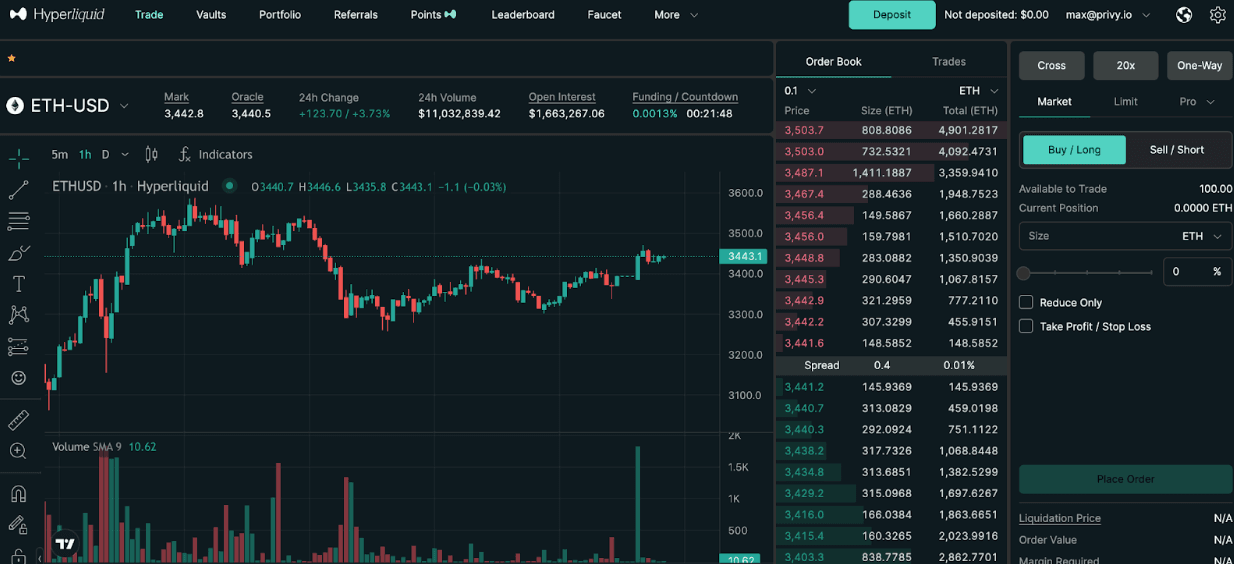 Onboarding for everyone: Users can sign in via external wallets or via email to trade via self-custodial embedded wallets, powered by Privy.