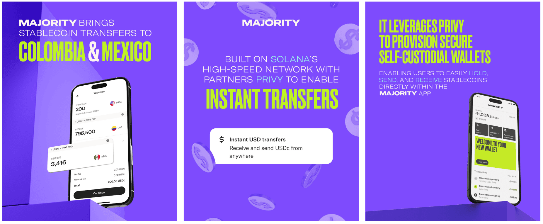 Today, MAJORITY announced the launch of its stablecoin-enabled wallet, unlocking free, instant, and secure transfers between the U.S., Colombia, and Mexico. Privy is proud to power the underlying wallet infrastructure that makes this possible, giving MAJORITY users the ability to hold, send, and receive USDC seamlessly on Solana.
