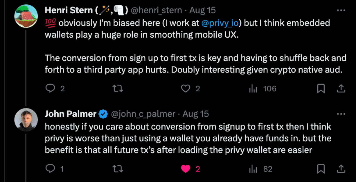 John makes a key distinction between initial onboarding friction and future friction for subsequent transactions. Put simply, embedded wallets make transacting on mobile much easier, avoiding the back and forth shuttling between the user's app and their wallet. However, they make initial onramping more complex—if the user already has crypto assets, those need to be bridged into their embedded wallet upfront.