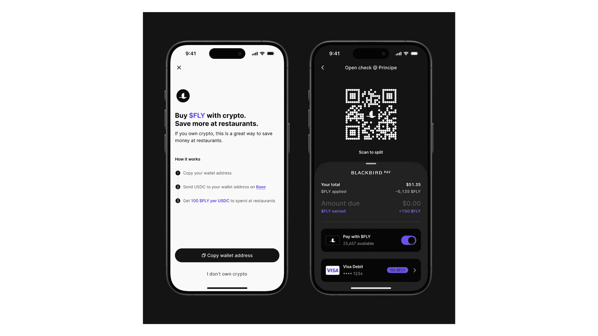 Restaurant payments app Blackbird also orchestrates multiple wallets for each user. Each user has two wallets: one holds the user’s onchain membership, the other acts as their spending wallet for their $FLY balance. This clean separation supports a modular account system while maintaining a smooth user experience.