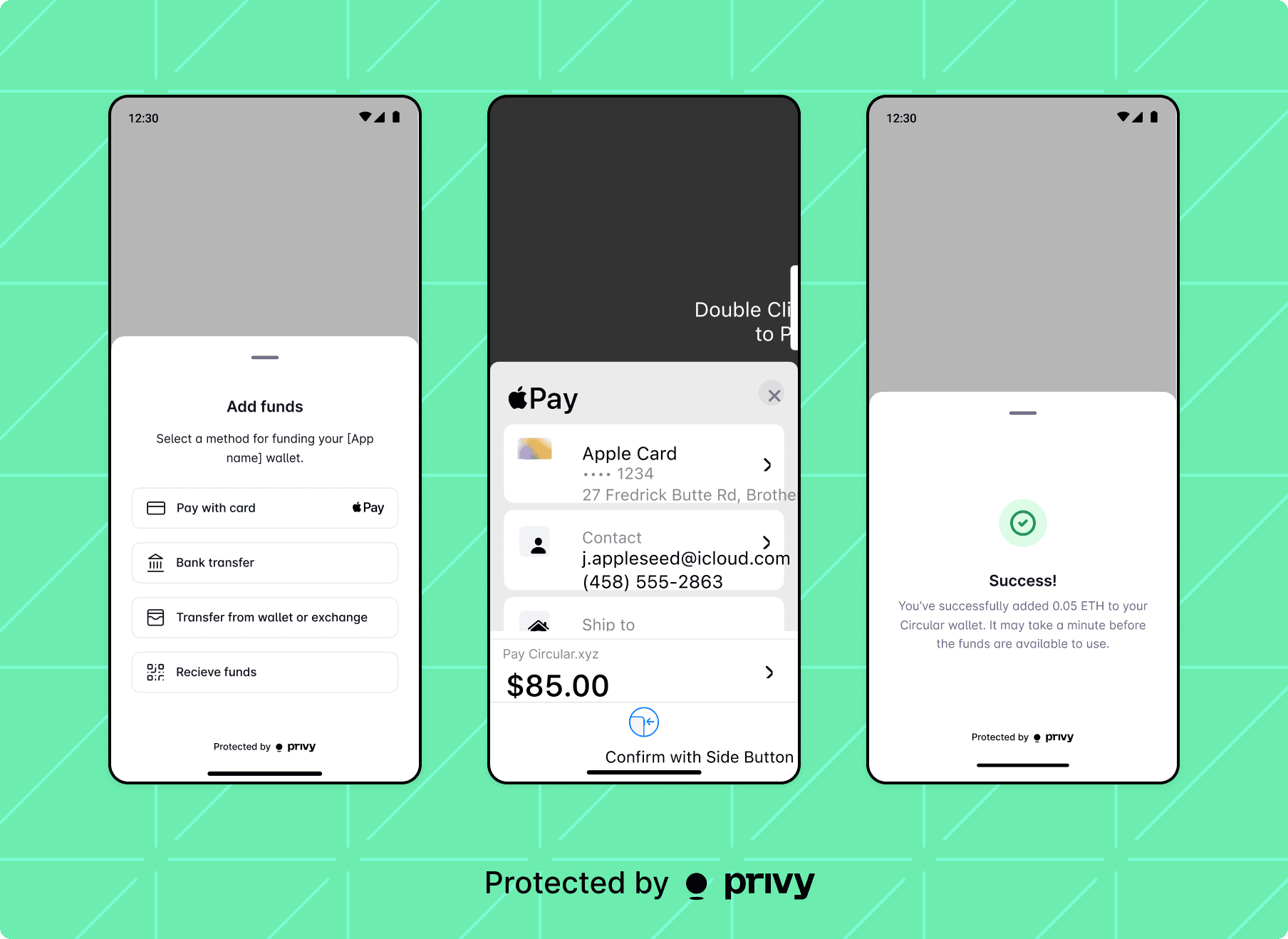 What's next: Apps need simple, frictionless onramping flows—including using Apple pay—to enable seamless in-app payments. Privy makes it easy to onramp fiat into wallets with out-of-the-box support for paying with card, Apple Pay, and Google Pay.
