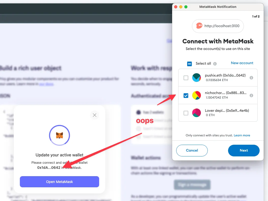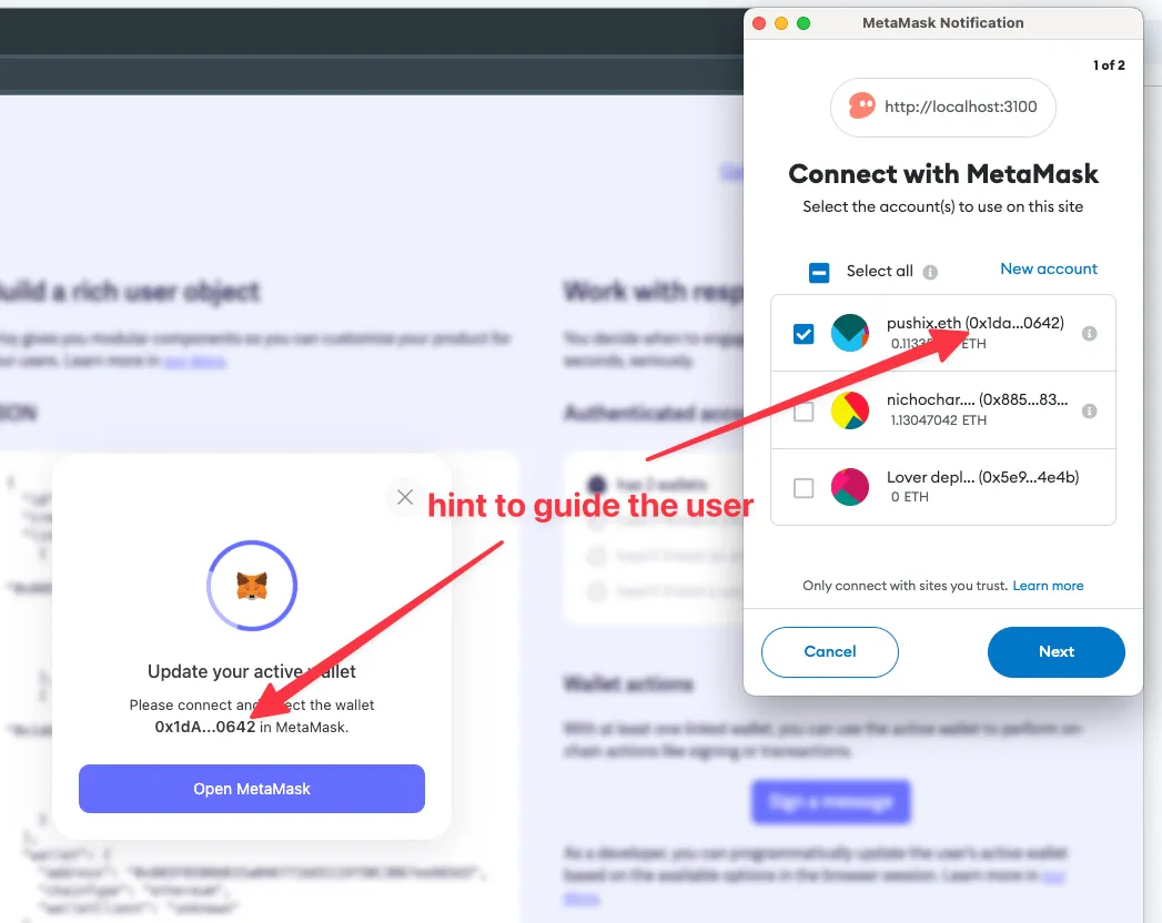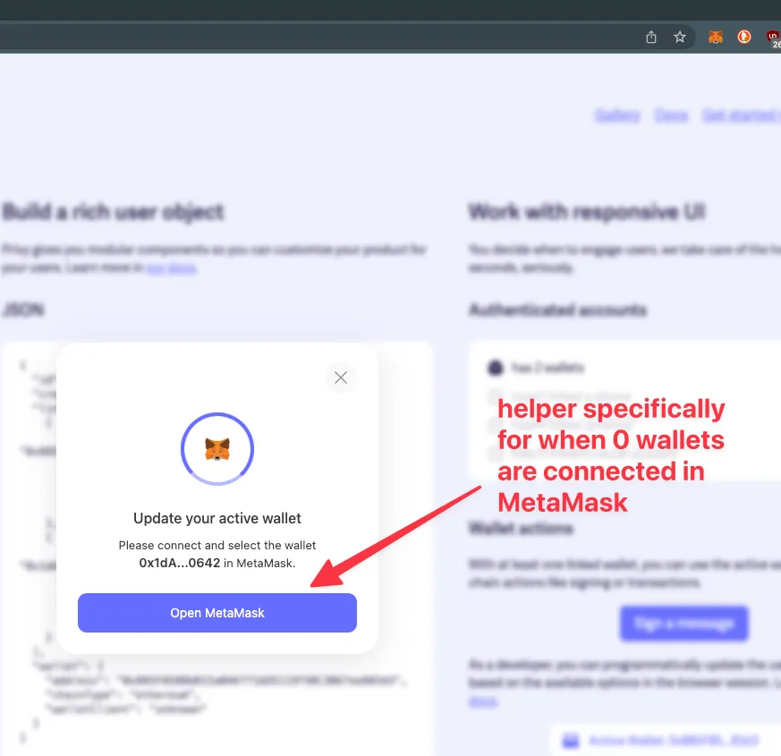 The user’s metamask is connected to the site, but with the wrong address. So the developer is calling "setActive(address1)" but the user has "address2" as the “selected” wallet in metamask. In this case, Privy’s SDK will nudge the user to switch the wallet in MetaMask, and MetaMask’s UI is quite helpful and intuitive.