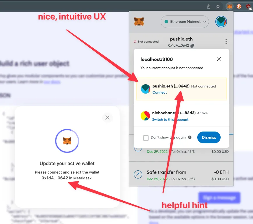 In this case, since MetaMask’s UI is acceptable, so Privy simply gives the user a helpful hint and they can do the switch on their own. This is surprisingly manageable for people that have multiple MetaMask addresses, probably because they are in the habit of switching them like this already.