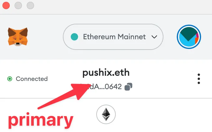 In addition to the above SDK state (connected-linked-active), wallet clients can have their own wallet state. Most of them, like shown in MetaMask in the below image, have a “primary” selected wallet at any given time.