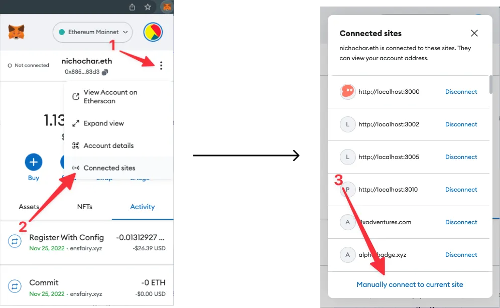 Unlike in case 2, MetaMask does not do a good job of connecting an address to the site from the extension, if no address is connected. The user has to know about an obscure flow, shown below: