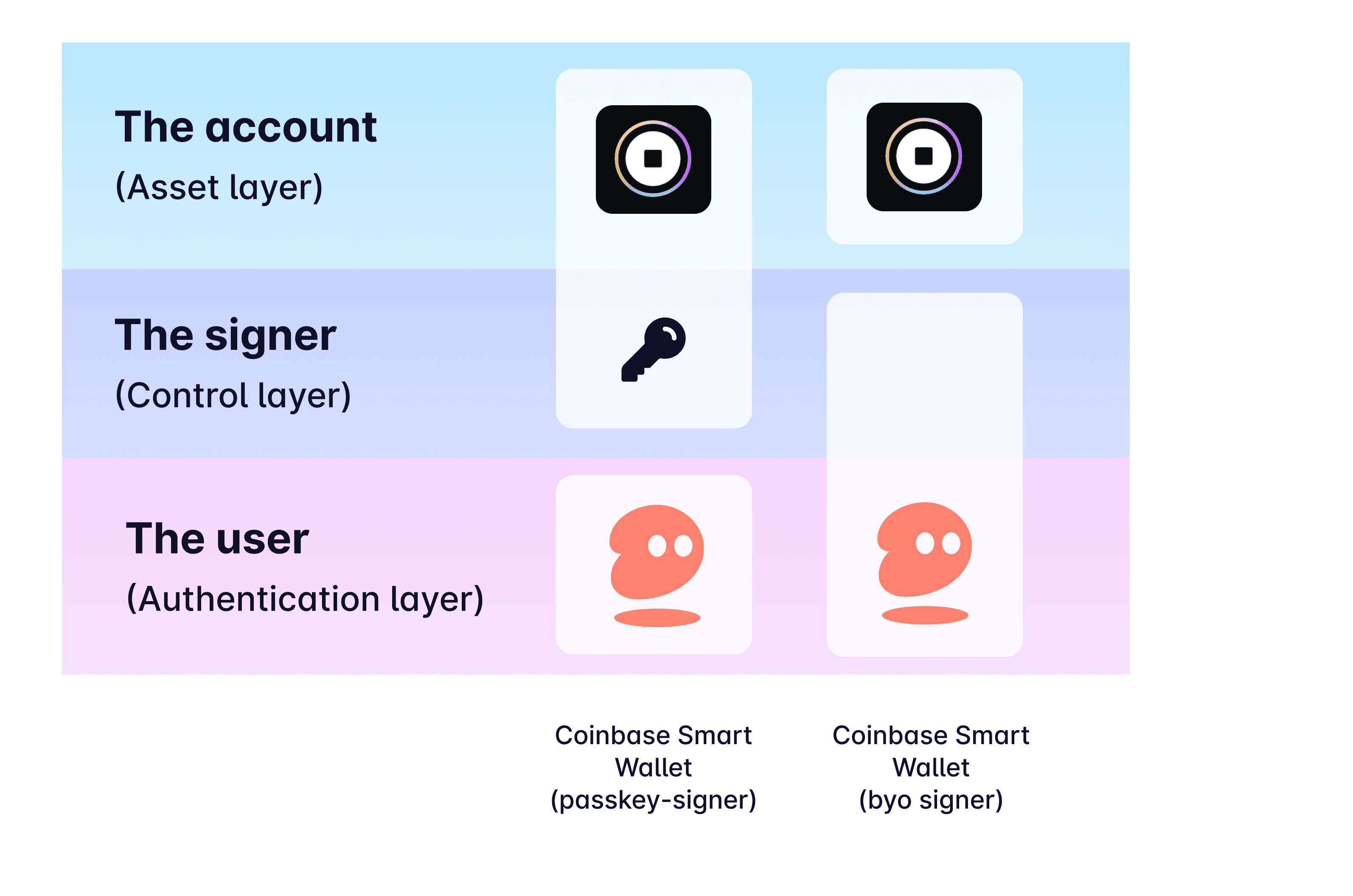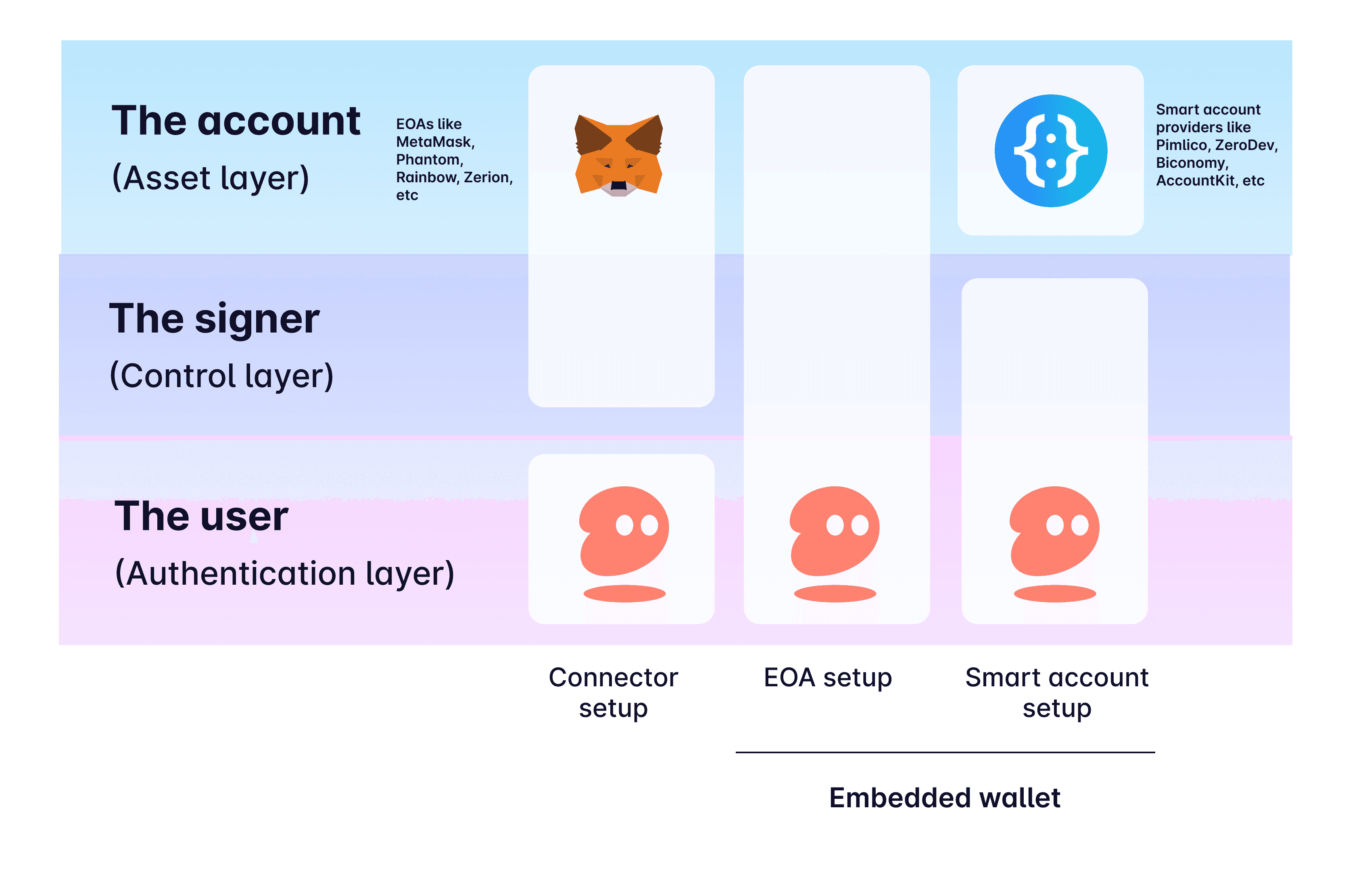 At a high-level, onboarding users onchain breaks down into three core questions: who is taking the onchain action (the user), through what means are they able to control this action (the signer) and where is the affected state (the wallet, or account).