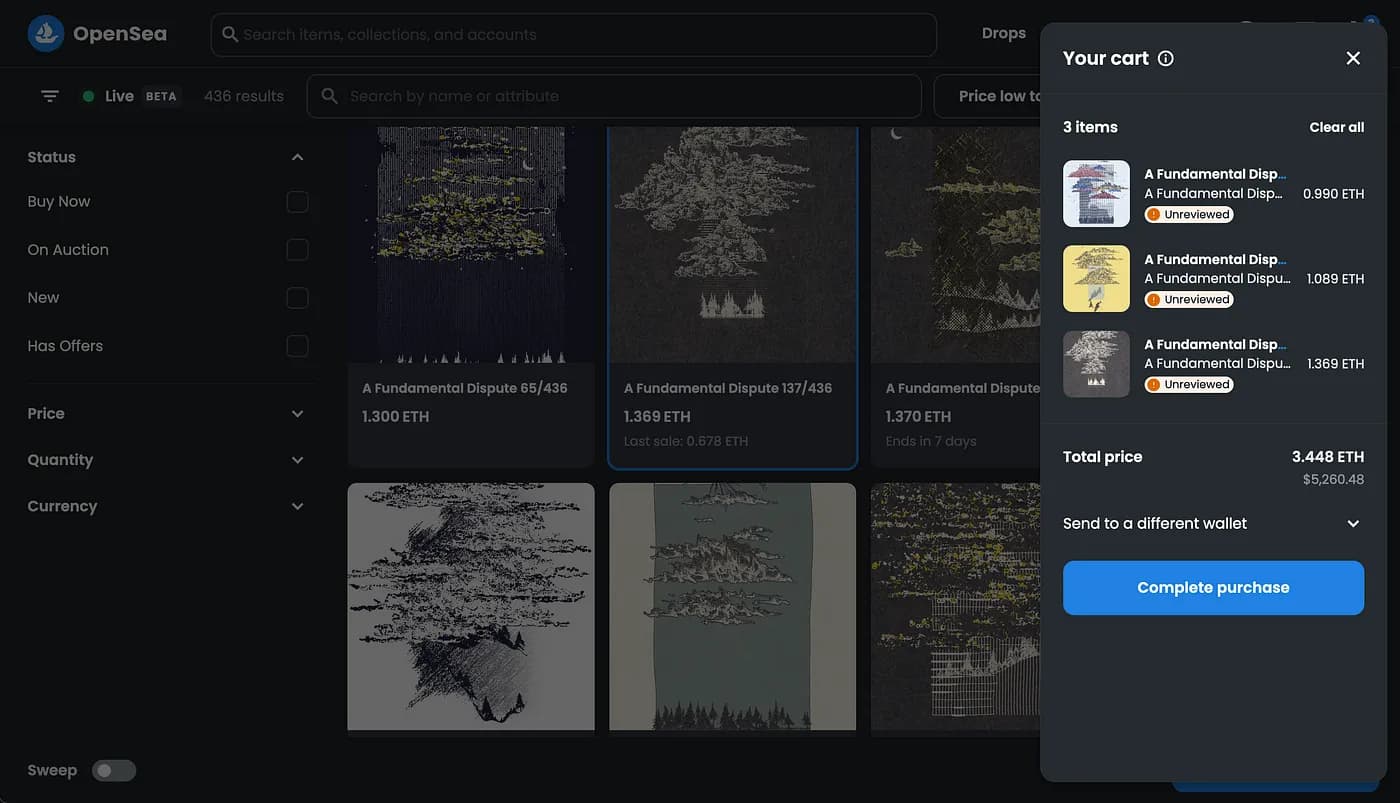 Next up, the great. Thanks to the introduction of the Seaport protocol, OpenSea can build more powerful UX. Their use of the shopping cart abstraction here is fantastic. In the below screen, you can see a wonderful mix of familiar and web3-native elements: