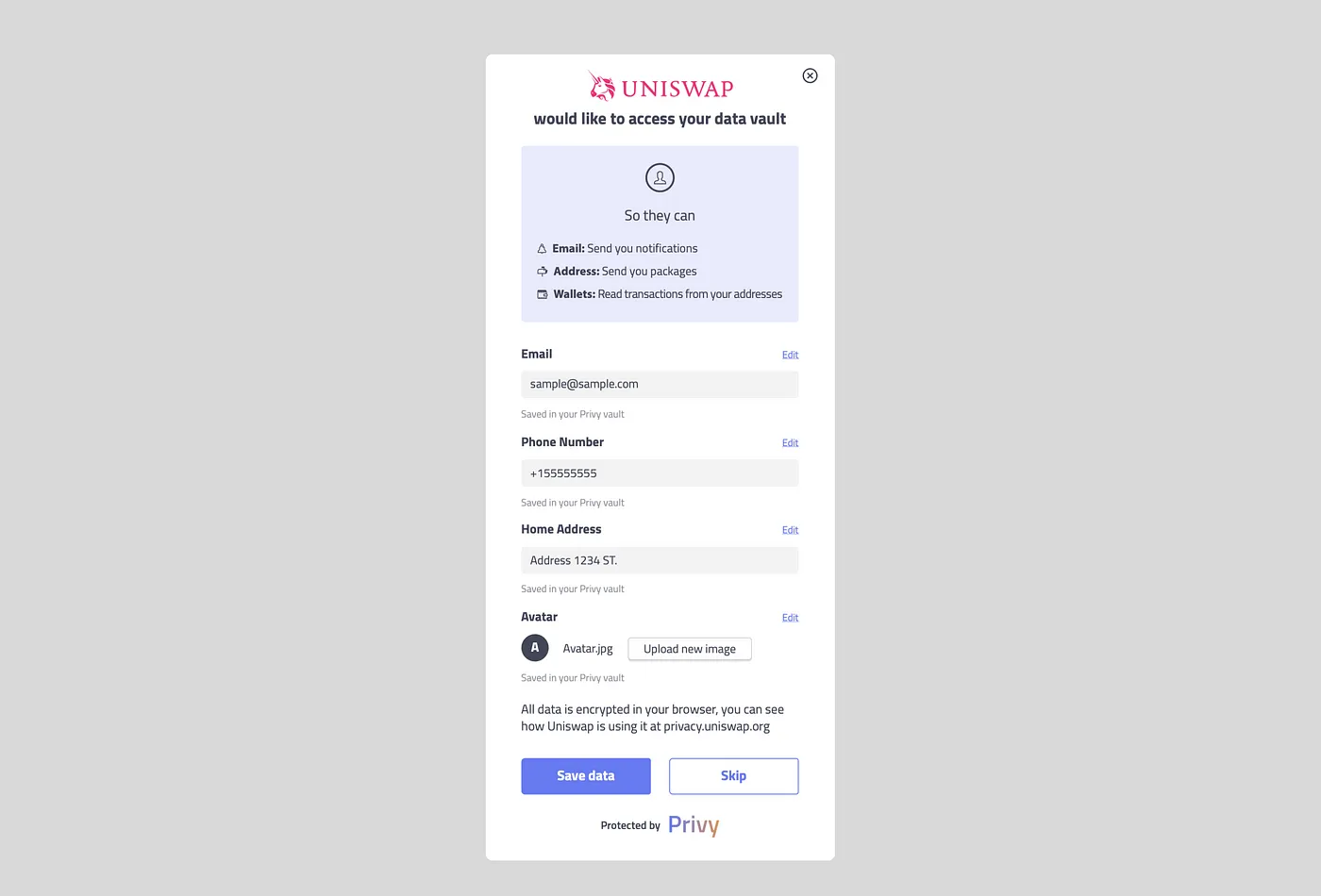 Today both schema (what data is needed) and permissions (who can access it) in Privy are set by developers. This enables them to securely take on user data without having to store it on their stack or risk data leakage through db misconfigurations or a breach of their perimeter.