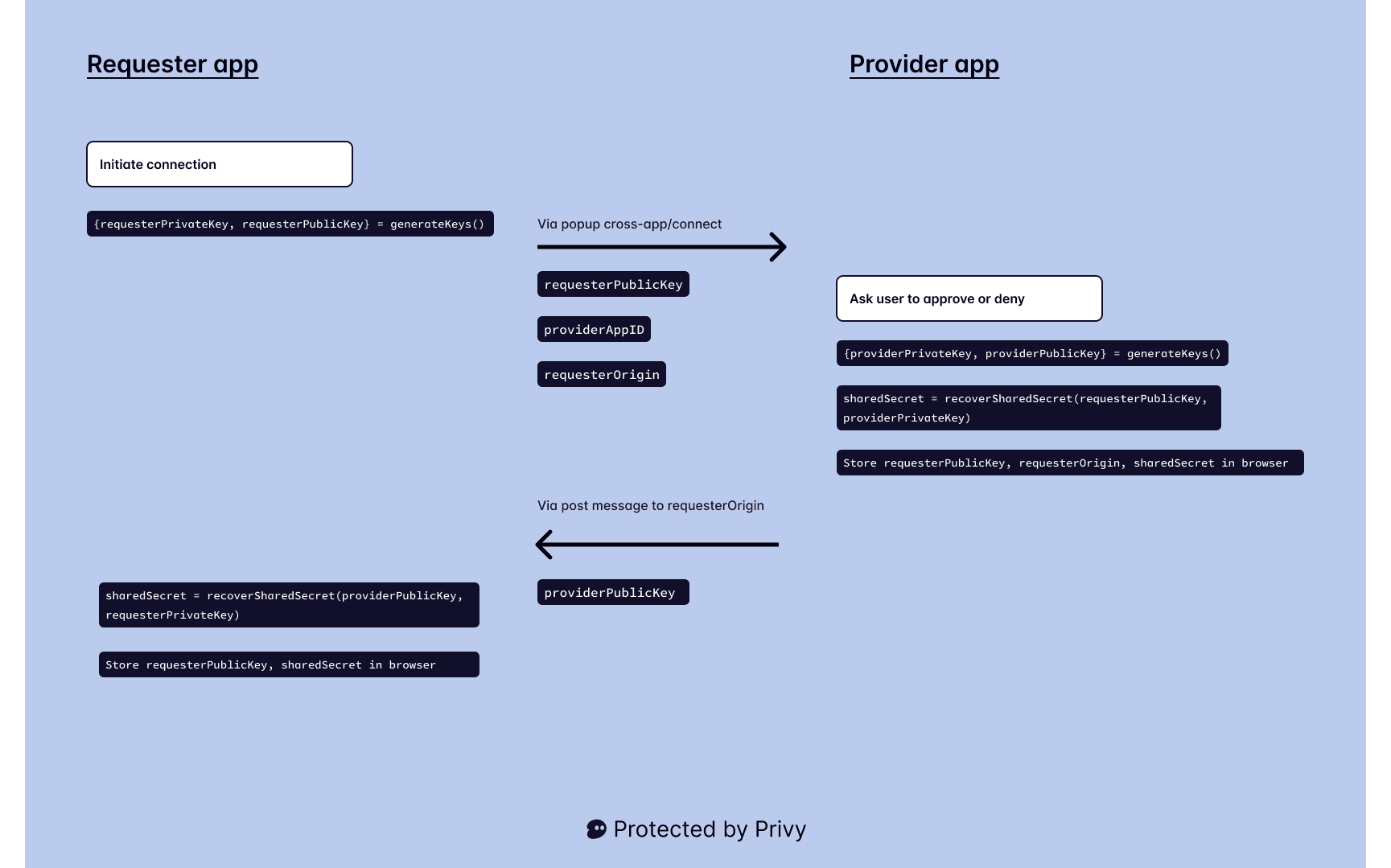 Let's look deeper into these two steps. Note that below, I will refer to the external application as the requester app and the wallet it wants to connect to as the Privy provider app.