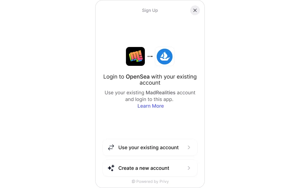 Let’s put ourselves in the shoes of a user. Alice is new to crypto and may not even know the product she is using runs on decentralized rails. She signs up for MadRealities using her phone number (and gets a Privy embedded wallet), earning a rose (NFT) in the process. Months later, Bob (her crypto-curious friend) tells her this rose is valuable and she should trade it on OpenSea. How can her embedded wallet enable this easily?