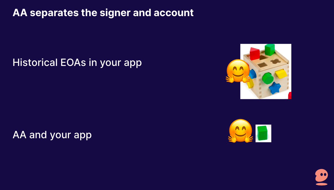 Separating the signing keys (your cryptographic keypair) from the account for which they sign is often referred to as “account abstraction.” This separation gives developers a lot more freedom on how to shape their UX and run their on-chain account system (to pay for gas on behalf of users on certain interactions for instance). Abstracting accounts away from signing keys lets the developer abstract a lot of the underlying technicals away from their user.